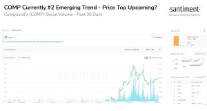 June 28, 2020Compound (COMP) could be nearing a local price top, soon after the Ethereum-based decentralized finance (DeFi) token recorded a 258% growth in ten days.And while “yield farming” has driven much of that growth, the Compound community has passed through a development proposal that would see incentives taken away from would-farmers.Local COMP Top Incoming?Blockchain analysts at Santiment predict Compound could be nearing a local top after the token took the top spot in their social media emerging trends list. The Santiment team tweeted on June 26:“As is our golden rule, when an asset like $COMP enters the top 3 on the @santimentfeed emerging trends list, it is generally indicative of an upcoming local top forming. We can see in this graphic that with every social volume spike, a sharp